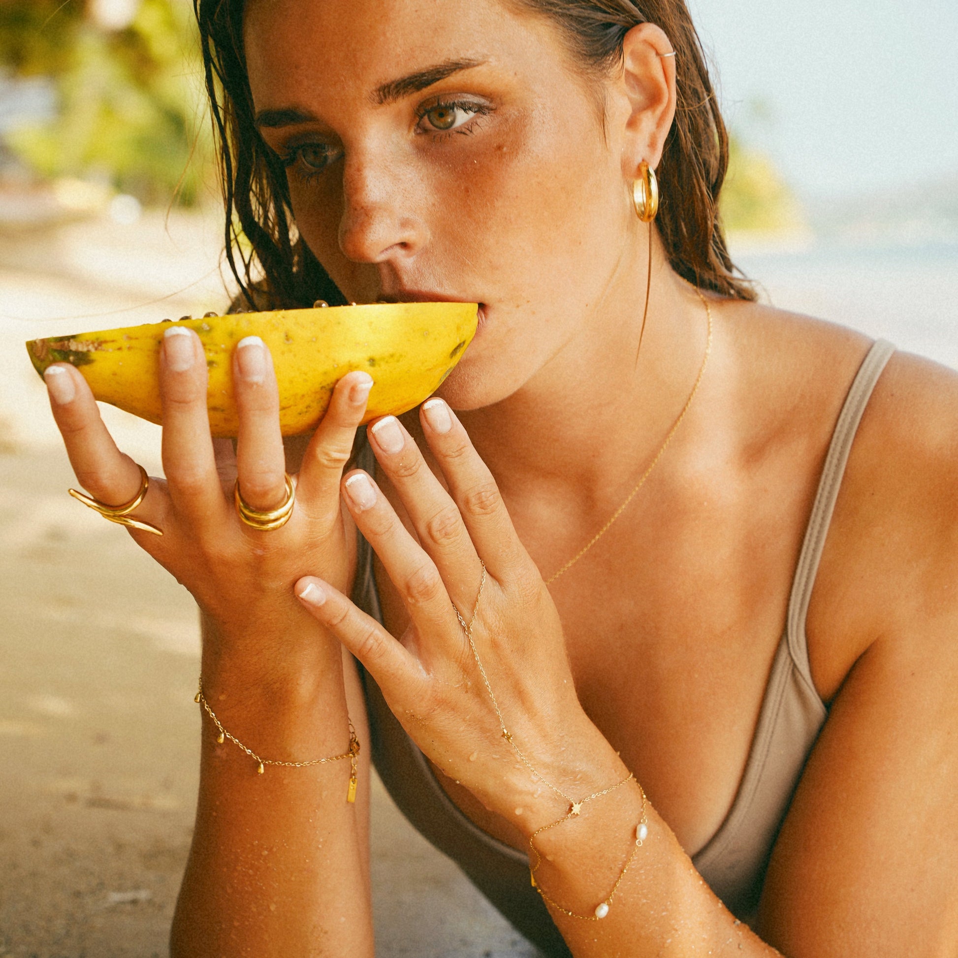 Rinse with fresh water after saltwater or chlorine. Pat dry and store in a soft pouch to keep the shine looking its best.